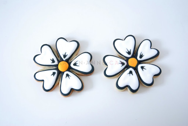 Vandaag was oefendag. Ik heb een hele berg koekjes gebakken en een flinke batch royal icing gemaakt. Allemaal om eens goed het uitlijnen en het vullen onder de knie te krijgen. Deze bloemen zijn gemaakt met zwarte lijnen. Dat vond ik zo mooi. Dat contrast. Dat wilde ik graag eens maken met een bloem. Lijkt me superleuk voor moederdag. Zo'n contrast boeketje. Nou maar hopen dat mijn mama mijn blog niet leest ;)